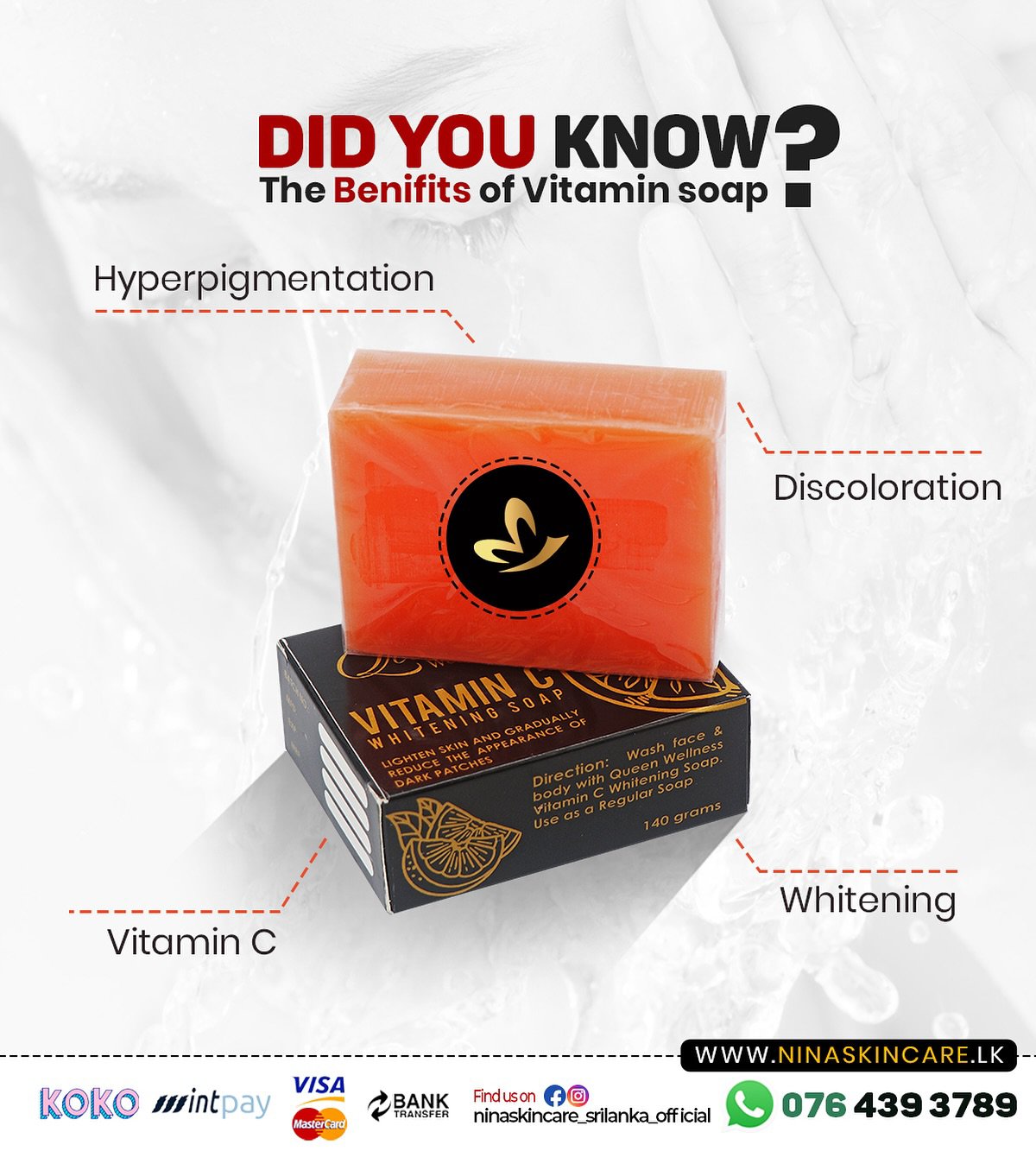 VitaC whitening soap, treats Hyperpigmentation, darkening or discoloration of the skin. Since VitaC soap promotes the removal of dead skin cells, the soap may gradually reduce the appearance of dark patches, lightening your skin. Queen VitaC lightening soap helps curb excessive melanin production.
